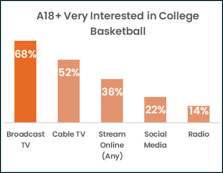 68% of Adults Who Are Very Interested in COLLEGE BASKETBALL watch Broadcast TV.